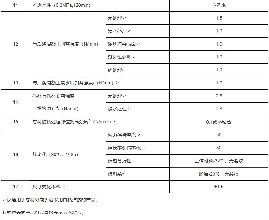 2.1材料性能: 產品執行GB/T 23457-2017《預鋪防水卷材》國家標準中P類要求(表2-1)。