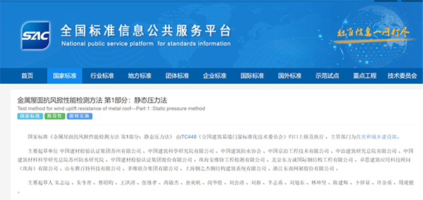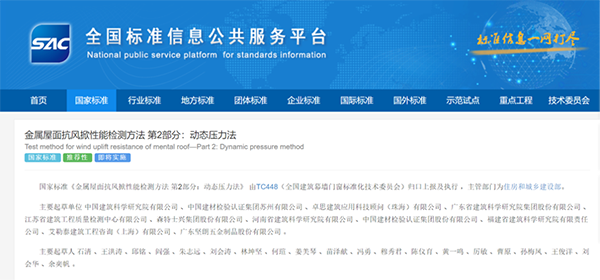國家標(biāo)準(zhǔn)《金屬屋面抗風(fēng)掀性能檢測方法 第1部分:靜態(tài)壓力法》發(fā)布于2021年3月9日,將于2021年10月1日實(shí)施。國家標(biāo)準(zhǔn)《金屬屋面抗風(fēng)掀性能檢測方法 第2部分:動態(tài)壓力法》發(fā)布于2021年3月9日,將于2022年2月1日實(shí)施。