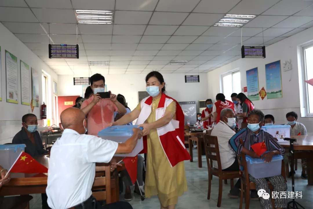 金風送爽,丹桂飄香,國慶將至,普天同慶。近日,江蘇歐西建材科技發展有限公司攜手淮安市洪澤區水上百合志愿者協會、區發改委黨總支、區朱壩街道社區衛生服務中心及愛心志愿者們前往朱壩街道敬老院看望慰問生活在這里的老人,開展了“敬愛老人 奉獻愛心”慰問活動。 歐西及發改委志愿者們為老人們送去了慰問品和防疫物資,并送上美好祝福。在親切的祝福問候聲中,讓每一位老人感受到了家庭般的溫暖,臉上綻開了幸福的笑容。現場醫護人員不僅為老人們一個個進行體檢,還給他們普及慢性病防治知識。