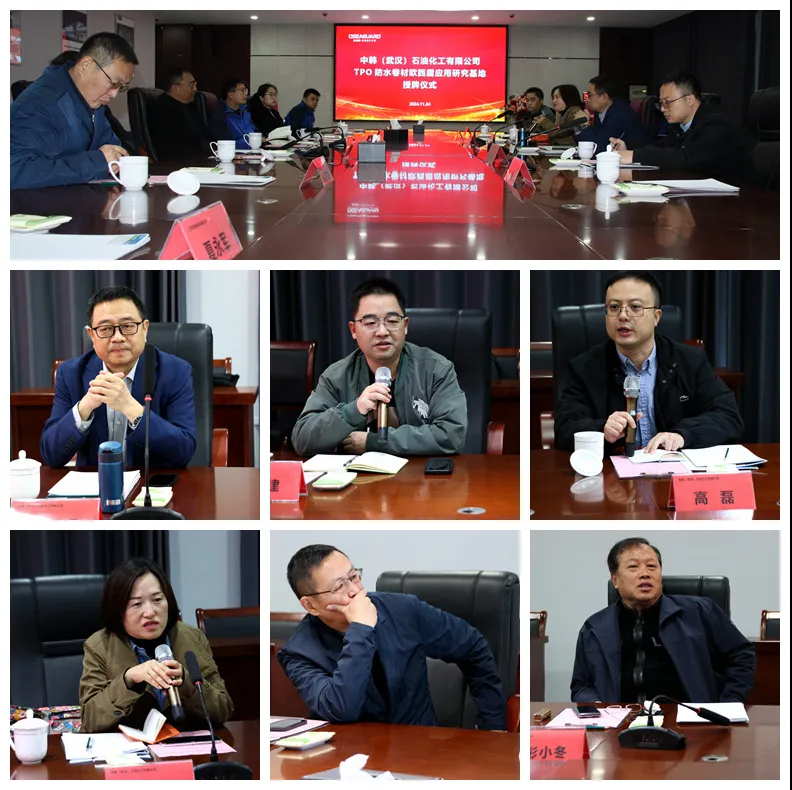 11月24日,中韓(武漢)石油化工有限公司“TPO 防水卷材歐西盾應用研究基地”授牌儀式隆重舉行。中韓(武漢)石油化工有限公司黨委書記、董事長、總經理劉百強、市場經營部副部長高磊、公司專家周雪云、研發中心副主任師李建、黨群工作部主管師付松,江蘇省遼寧商會會長彭小冬,中石化南京項目管理中心副總劉洪旭,江蘇歐西盾科技有限公司董事長王洪波、總工程師顧金佳、市場總監丁彥臻及各部門領導參加本次活動。